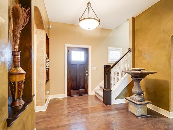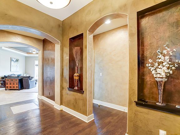 Welcome home to your elegant yet comfortable private retreat from the busy world. Located at the end of a cul-de-sac, your beautifully landscaped rear yard overlooks a serene pond. You'll notice the home's exterior details, like robust columns and arched entryways, seamlessly flow into the interior. As you step into the foyer, with its large architectural niches, you'll find a stairway to your right leading upstairs, a hallway to the owner's suite on the right, and straight ahead, the very open kitchen, dining area, and great room. The neutral yet moody color scheme fits the home perfectly. The great room features a boxed ceiling with intricate detailing, recessed lighting, and three large picture windows with transoms above, providing a beautiful view of the pond and allowing natural light to flood the space. The fireplace, with its black accents and beautiful stonework, serves as a true focal point, visible from both the kitchen and the dining area. The kitchen boasts custom cabinetry, stainless steel appliances, and granite countertops, creating a visually stunning and efficient workspace. A large sliding glass door in the dining area opens to the fenced-in area of the rear yard, enhancing indoor-outdoor living. The owner's ensuite is a retreat on its own, featuring a boxed ceiling, a sliding door to the unfenced part of the yard, an additional patio, and a hot tub (negotiable). The ensuite bath includes a double sink vanity, a walk-in ceramic shower, separate stool area and a spacious walk-in closet. On the other side of this split bedroom floor plan, you'll find two additional bedrooms and a full bath. The laundry room is equipped with custom cabinets, a folding area, and a laundry sink. Upstairs, a versatile rec room/family room awaits, featuring a dormer area set up as a study/office, an entertainment area, and ample space for a pool table (the seller is willing to include with a strong offer). The oversized, pristine garage boasts an epoxy-finished floor. The outdoor living space includes a large, fenced area with a patio and a grilling station (the green egg is negotiable with a strong offer). Additionally, there is a second outdoor living space with a large patio, beautiful landscaping, and a pond view.