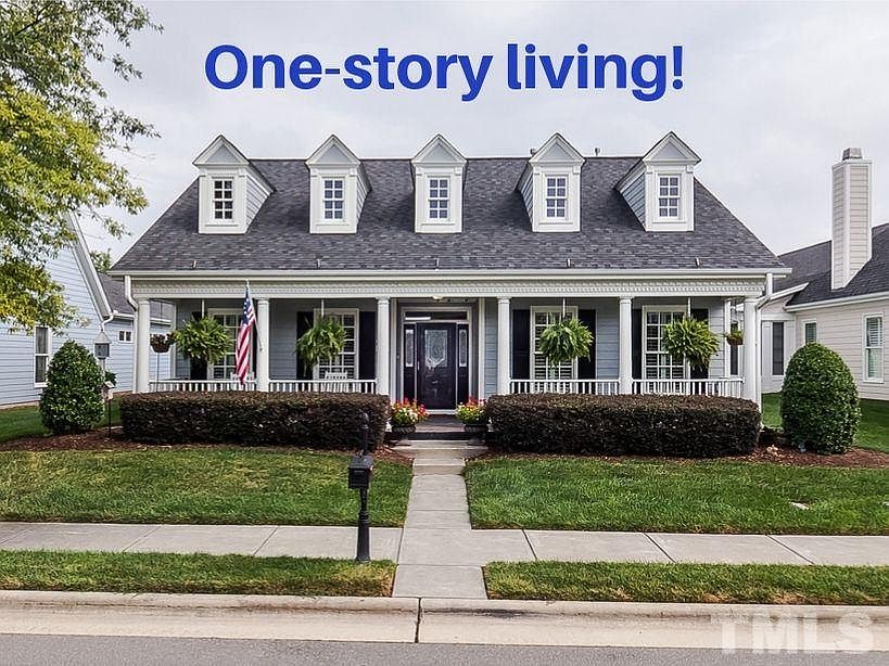 A true ranch that offers one-story living at it's finest. You'll be drawn in by the open floor plan, luxury kitchen, gorgeous hardwoods, & private, relaxing patio - but you'll stay for the fresh paint, newly cleaned carpets, cozy sunroom, & versatile flex space. Need more? How about no-show A/V wiring, security system, amazing garage, & lawn maintenance w/ irrigation included. Close to plentiful shopping, dining, RTP & 540 access too.
