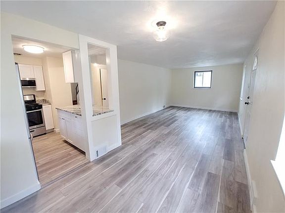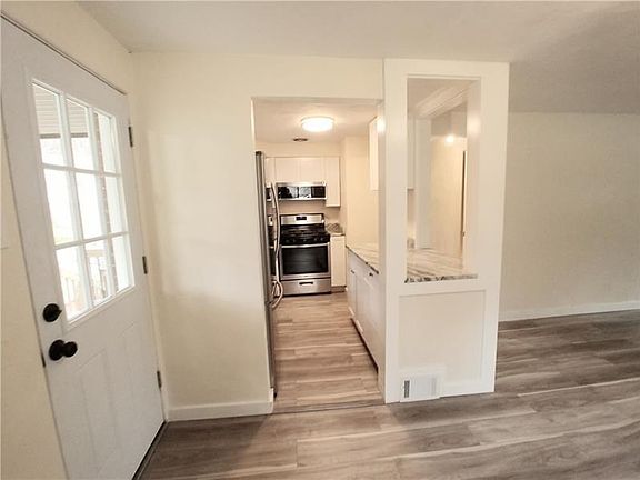 This 3BR, 1.1 BA quaint red brick home features a totally re-done kitchen with gorgeous quartz counter tops, fully re-done and updated bathrooms and a newly-updated basement living space! There is a delightful and touched-up deck that comes off of the kitchen and goes down towards the backyard (which features a creek behind the trees)! The elegant front entryway with attractive, tall white columns welcomes you into the large living room and open kitchen. The master bedroom sits across from the master bath on the first floor, and the upstairs features two more spacious bedrooms. The basement -- newly re-done -- is perfect for an office, den or playroom. The basement level also features garage access and a re-done powder room.