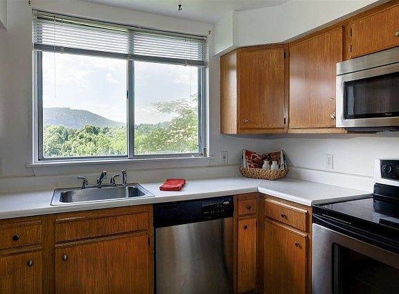 Panoramic Mountain Views with City Convenience! Dine and lounge daily with a bird's eye view from this charming 2 bed 2 bath condo! Large windows in kitchen and living room. Easy, carefree living. Walk to the Historic Downtown Mall. Work from home or drive a stone's throw to I-64. A quick bike ride takes you to PVCC and UVA. Master bath has WHIRLPOOL tub! Stainless steel appliances (refrigerator, microwave, stove and dishwasher) adorn the kitchen. New: heat pump, hot water heater, and easy-care durable laminate flooring in living room, dining room, hall. Bathrooms and kitchen have new vinyl. Pilot Mortgage says, on Monticello Overlook Condos, they will keep provisions in to safeguard warrantability for financing, even if all are rentable.