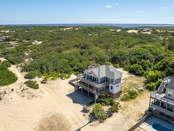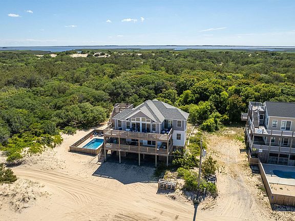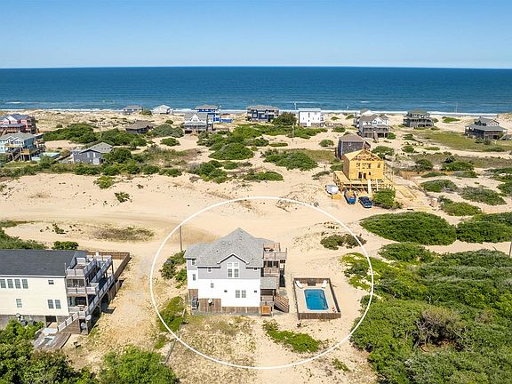 Beautiful coastal beach cottage with a reverse floor plan built in 2018! This 6th row location backs up to the Currituck National Wildlife Refuge so no neighbors behind you for added privacy! The 4 BR, 3.5BA home has proper elevation in the preferred X flood zone and offers ocean views from all levels. Two ensuites, one on each floor. Both ensuites offer tiled showers. All four bedrooms have East facing ocean views and exterior access to abundant outdoor deck space. You will find engineered hardwood flooring throughout the foyer, hallways and upper living area, carpet in bedrooms and tile flooring in all bathrooms. Five panel craftsman doors throughout and nickel finish door hardware. In the spacious kitchen you will find a central island, stainless steel appliances, solid-surface countertops, shaker style cabinetry, tile backsplash and soft close drawers. The top floor great room offers endless ocean views and natural light with ample seating for the whole family along with direct access to the large South facing screened porch. Exterior wrapped in maintenance free vinyl siding and trim. There is a private inground pool perfect for relaxing after a great day on the beach and also a hot tub located on the HUGE mid-floor deck. Catch a breathtaking sunrise or sunset from the rooftop deck where West views abound over the Wildlife refuge to the Sound, East to amazing ocean views or South where you can actually see all the way to the Currituck Lighthouse! When the current owners are not enjoying the home themselves, they have had great success as a weekly VRBO vacation rental with strong yearly rental income. Would be perfect as both a second home or weekly vacation rental.