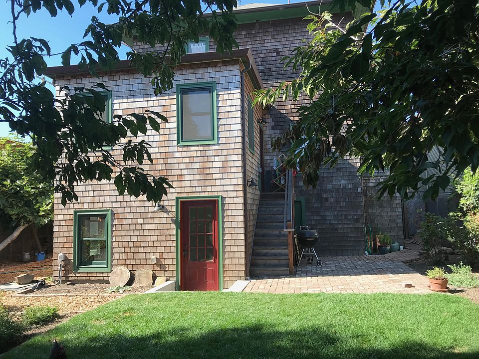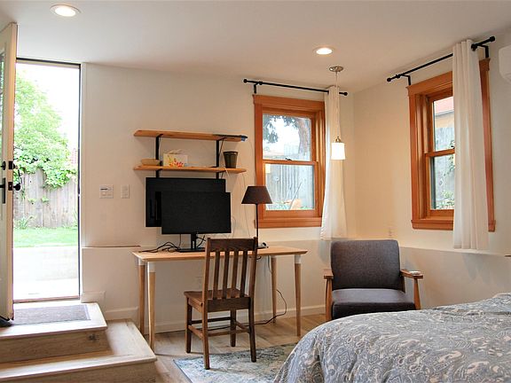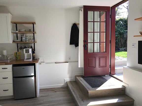 In-law garden studio behind South Berkeley home. Private entrance. Fully furnished. Full size bed, desk/table, kitchenette (countertop oven, microwave, two burners, electric kettle, blender, apt fridge), bathroom/shower, storage/closet space, natural light. Access to garden, large brick patio, basement for washer/dryer and bike storage. Three steps down into apt. Walking distance to public transit (BART, bus), Cal, two city parks (field, basketball, tennis, baseball), Berkeley Bowl grocery store, drug store, bakeries/cafes. Easy freeway access. Utilities included + high-speed wifi, TV. Un-zoned street parking and/or driveway. We have a big friendly dog and two cats. Lease duration negotiable. Month-to-month, 3-month minimum; longer term possible. Two-months notice for departure. $1500/month. Payment of first month+ last month + security deposit upon signing the rental agreement. Un-zoned street parking and/or driveway. No smoking. No pets.