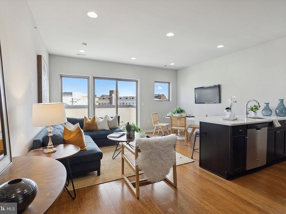 This fabulous 2 bedroom, 1 bathroom apartment home is a top floor unit with a private balcony, is located in the heart of Francisville and surrounded by new construction. Close to The Met, Bar Hygge, Rybread, Osteria, public transportation, parks, Temple University, and more. Gorgeous, next-generation laminate flooring flows seamlessly throughout the open-concept living area. The space is perfect for entertaining. Enjoy a modern kitchen boasting espresso flat-panel cabinets, white quartz countertops, gray subway tile backsplash, a center island with seating, and stainless steel appliances. There are two, good-sized bedrooms both with neutral carpeting and plenty of closet space. The rooms share a full bathroom with tile flooring and a tub/shower with tile surround. Washer and dryer are conveniently located in the unit. For a limited time, and with an acceptable agreement of sale, seller will pay six months of HOA fees.