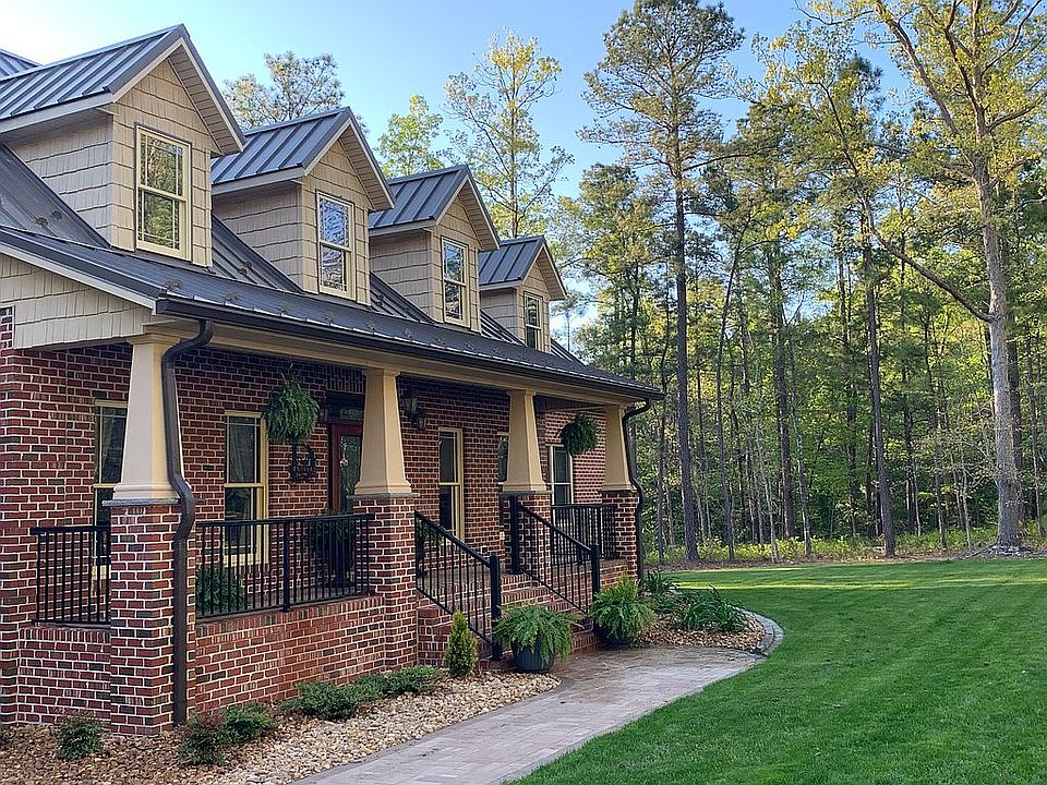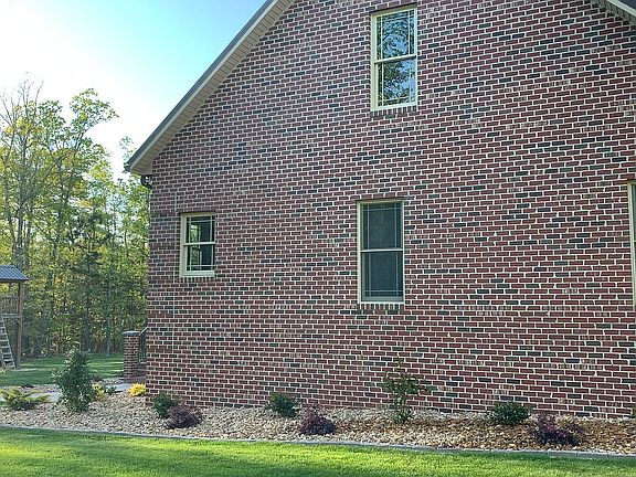 The owners spared no expense when building this beautiful brick home that is situated amongst young oak trees in the middle of 17+ acres. 100+ year old heart pine beams were used in the construction of the main living area & the same rough sawn wood was used in the center panels of the kitchen cabinets. 9' ceilings are covered with Ponderosa pine board & the floors are 3/4" solid Hickory. The upstairs is 1800sf & could easily be finished into a few more rooms & another bathroom. Foam insulation, aluminum clad exterior darkening windows, & 5/8" radiant barrier roof sheathing for reflecting heat, make this home energy efficient! Crawl space completely encapsulated & there are drain tile installed around the interior and exterior of the foundation that drain into the woods. The exterior of the 32x48 detached garage matches the home & has a concrete floor, walls covered with metal panels so you can weld, service pit, & plenty of power for working on your toys. Large patio, low maintenance yard, and custom playset are perfect for entertaining. List of improvements is in the photos. Long Branch creek crosses the rear of the property. Just enough pasture for a couple horses!