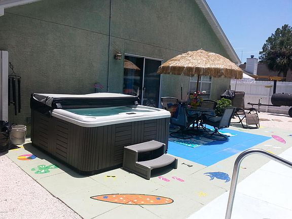 Don't let this beautiful home. This immaculate 3 bedroom, 2 bath, 1 great room home features many amazing features which include carpet, tile floors, ceiling fans, and surround sound. The stucco exterior has been sealed with elastomeric paint. The kitchen features appliances: ceramic stove top, garbage disposal, microwave, and refrigerator. Dining room is separate from kitchen. The Living Room features a wood burning fireplace and overlooks the 16x32 in ground 9' deep gummite pool and hot tub! There is a 20 x 20 great room with a large closet which could be turned into a fourth bedroom, and lovely French Doors leading to the outside. Gas water heater and a high efficiency central electric heat pump/AC. New low maintenance land scalping and two new storage units.