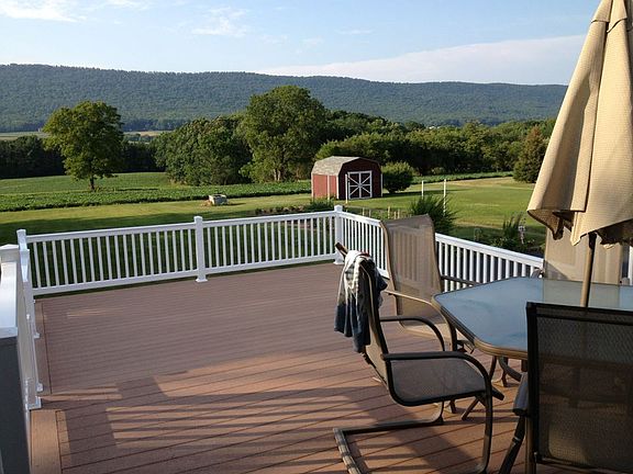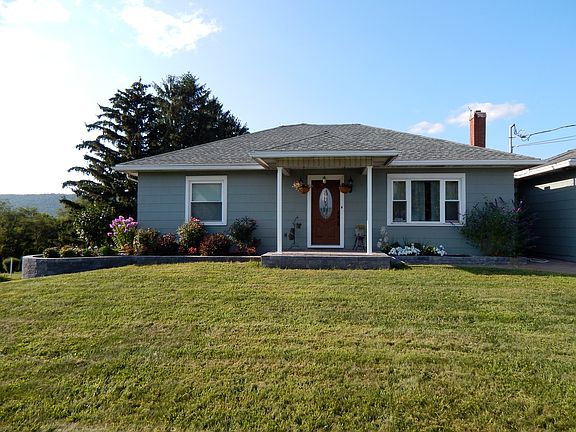 Enjoy single story living in a rural setting. This 2 bedroom, 1.5 bath home has been updated and is move-in ready. Also includes 2 attached garages with new garage doors. Exterior features include retaining wall flower beds, new roof (2013), new windows, new front door, 2-tiered composite deck with vinyl railing. Deck has view of large back yard, fields, and wildlife as well as beautiful mountain views. Interior includes oak hardwood floors in living room and 2 bedrooms. Potential for third bedroom in upstairs space which is currently used as an office. Office has new carpet. Full bath has new tile floors. Kitchen has stainless steel appliances, granite counter tops, tile back-splash, and well-built oak cabinets. Partially finished basement that is tiled and also has .5 bath and separate shower. Home currently has coal heat. Friendly neighborhood with elementary school within walking distance.