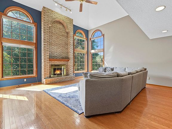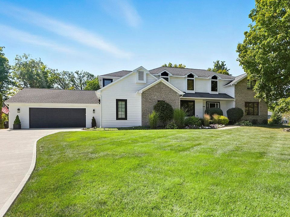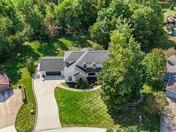 Built by Bob Buescher Homes in the Northside neighborhood of Woodland Lake, you will discover this beautiful home with an excellent .81-acre lot, a giant climate controlled 5-car garage and a terrific walkout basement. This spacious 4,079 Sq-Ft home has 4 bedrooms and 3.5 baths; it is surrounded by views of mature trees and lush landscaping. The main level features rich wood flooring, a formal dining room, a cozy breakfast nook, a centralized kitchen is equipped with Grabill Cabinets, a granite island, a vaulted family room with a brick gas-fireplace and floor-to-ceiling windows, an entry foyer with an elegant staircase, a private living room, a separate laundry room and the half bath. Upstairs holds all 4 bedrooms and 2 of the 3 full baths. The large primary bedroom has a coffered ceiling, a balcony, an ensuite bath with double sinks, separate shower and a modern freestanding bathtub. The finished walkout basement has a rec-room with a fireplace, a wet bar with a table area, a workout room, a full bath and an unfinished storage room. The lower patio is surrounded by greenery, offering complete privacy with no neighbors in sight. Main floor and basement windows were replaced around 2017. Driveway was new in 2022 when the extra garage was added. Woodland Lake has large lots, seven lakes, spacious custom homes, mature trees, walking trails and a pool making it an ideal place to call home.