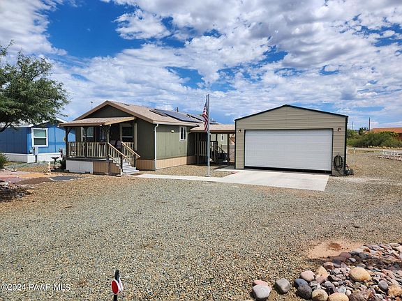 Seller Will Carry Owner Financing! Call for Details. Beautiful home here nicely kept and nearly new. Front and Rear Quality Landscaping . Nice Rock/Gravel and design. Outdoor Living Areas that Feature Firepit ,horseshoes, Apple and Pear Trees,, Shed , Gazebo with chairs AND RV hookup TOO. Massive Drive through RV Parking Can Fit any size Trailer or RV. Dual Car Garage or Shop with recently Added Storage extending garage walled off separately. Solar on this home is the best no fees & Owned! APS bill is cheap was $3.00 last month no payments! Elegant Kitchen with Awesome appliances ,Covered Roof extends from Garage Over the side deck to the home. New skirting. Nice Flat Work . Great Home Spacious Bedrooms and All Appliances Come with Turn Key! 5000 Water softener Added!