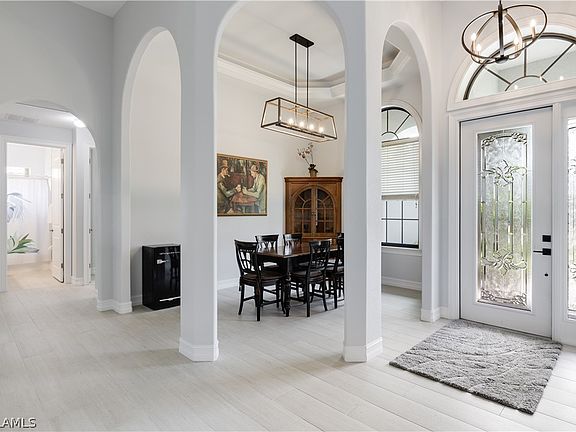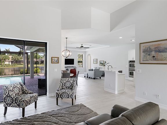 In the small gated neighborhood of Veridian just 5 miles from Sanibel Island & minutes to fine restaurants and shopping, you 'll find this move-in ready home built by Gulfstream Homes, a Naples custom builder. You'll appreciate the open floor plan with superior finishes, custom millwork, and coffered ceilings and crown molding in the dining room, family room and primary suite. Ceiling heights range from 9' 4" to 13 feet. 3 sets of 8 ft sliders, solid 8 ft interior doors, rounded corners, and 5 1/4 inch baseboards are features you 'll appreciate. There's new 48 inch long plank tile flooring throughout. The spacious kitchen with center island facing the water gives the chef a view while cooking. There's new shaker cabinetry, quartz counters, big pantry and long breakfast bar overlooking the family room, breakfast nook and lake. The primary suite has 2 generous walk-in closets. Adjoining bath has dual vanities with quartz counters and walk-in shower, new in 2023. As you soak in the freestanding bathtub, look up-you can see the clouds in the sky as you relax! The pool with salt system was aded in 2014- pool pump motor + salt cell replaced in June 2023.The large yard (100 wide x 138 deep) gives you privacy, lawn care is included in the HOA fees. Sprinklers are on a private well for irrigation so you're not paying to water your lawn. Window blinds in the primary suite and family room are motorized. Storm protected: Impact windows on front, accordion shutters on sides, Lexan (clear) shutter panels for sliders and front door. Assumable flood policy: $734/year. Tile roof replaced June 2022. Dual zoned a/c units replaced Feb. 2023 (both handlers and compressors) Post-Ian renovations were permitted and inspected. If you're ready to enjoy the Florida lifestyle, call to view this beauty. ** Don't pay 7% interest! SELLER FINANCING might be negotiated-call for details.