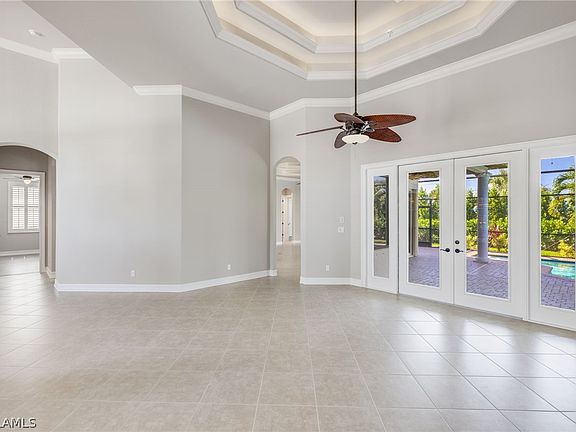 Prepare to be wowed! In the small gated community of Veridian, located just minutes from the white sandy beaches of Sanibel, Captiva and Ft. Myers Beach, you'll find your next home. As you enter the double door entry into the foyer with 17 ft ceiling, you'll appreciate the attention to detail and design of this 4 bedroom + den, 4 bath home built by Gulfstream Homes, a Naples custom builder. There's coffered ceilings and crown molding in the entry, living room, dining room, family room, den and master suite. 8 ft solid interior doors, rounded corners, superior finishes and custom millwork. New kitchen remodel was done by Cornerstone Builders. Stainless kitchen appliances including double convection oven and French door refrigerator all replaced in 2023. There's under (+ over) cabinet lighting. The spacious primary suite has a sitting area and opens to the covered lanai and pool area. Adjoining bath is H-U-G-E, oversize vanity with dual sinks, jetted tub, new and improved walk-in shower. Water heater and both air conditioning condensers replaced in 2023, tile roof replaced in 2022. The large yard ( 100' x 138') gives you privacy, lawn care is included in the quarterly HOA fees. Sprinklers are on a private well so you don't pay to water your lawn. There are Plantation shutters throughout the home. The heated pool can be enjoyed year-round. The seagrape + buttonwood hedge in the back yard give you privacy while you're enjoying your pool. The owners have an ASSUMABLE FLOOD INSURANCE POLICY: $603 per year. Storm Protected: Impact windows in front, accordion shutters on side windows and sliders, Lexan ( clear) wind rated shutters for aquarium window in dinette, electric shutter for front entry door. All of the hard work has been done- you just need to move in and start enjoying the Florida lifestyle. With over 3100 sq. feet living area on 1 level ( no stairs) and an oversize 3 car garage, spacious homes like this on large lots are uncommon.