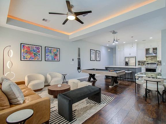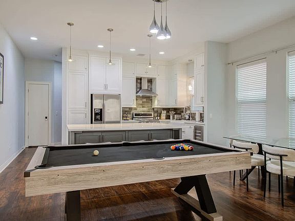 Welcome to a beautifully appointed home designed for comfort, entertainment, and ultimate convenience. Every space has been thoughtfully arranged to accommodate groups and families in style. The heart of the home is the expansive main floor, featuring a bright and open layout. The living area is centered around a full-size pool table, perfect for entertaining, and also includes comfortable seating for relaxing and socializing. The stunning gourmet kitchen is fully equipped for any culinary adventure. It boasts top-of-the-line stainless steel appliances, a large island with bar seating, and ample counter space. It comes stocked with all the cookware, dishes, and utensils you need to create memorable meals. The upstairs master bedroom is a private retreat featuring a plush king-size bed. This suite also includes a dedicated workstation with a desk and chair for productivity, an en-suite bathroom with modern fixtures, and a spacious walk-in closet. Two additional bedrooms provide flexible and comfortable sleeping arrangements for the whole group. One room contains two full-size beds, while the other features two queen-size beds, ensuring everyone has a restful night's sleep. These rooms share a well-appointed full bathroom. A convenient half-bath is located on the main floor for guests. Step outside to your private outdoor space, which includes a paved patio area for lounging or dining and a cozy grassy area, perfect for kids or pets to play in a secure environment. Enjoy the convenience of a full-size washer and dryer. Parking is exceptionally convenient, with a private 2-car garage and a driveway that provides additional space for 2 more vehicles, for a total of four dedicated parking spots.