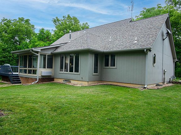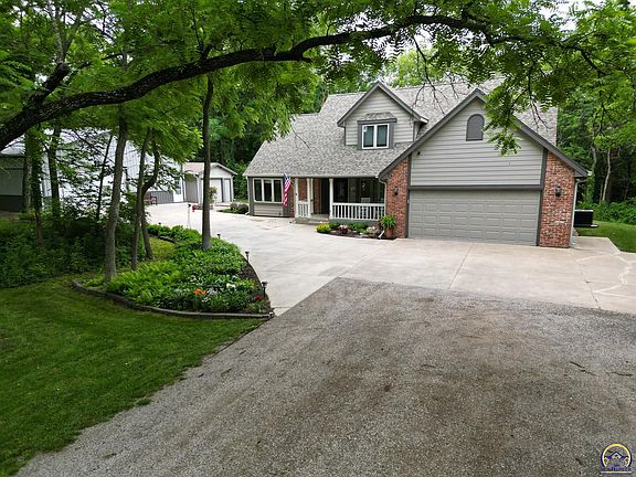 One of a kind 1.5 Story home on a 3.60 Acre Wooded & Private Site off of 45th St just Seven miles West of Lawrence off 45th St. or twenty minutes East of Topeka. Close to wherever you live or work at + Paved Roads all the way. 3 BR, 2.5 Ba great rm w/soaring ceilings & windows in each rm, open to nature, trees. where wildlife abounds. Every room has a view! Attached is an oversized 2 car garage, a separate exterior 36x34 garage with electricity +a reg walk in door. Another sgl garage is a great place 4 landscape equipment. There's a garden shed with a curved concrete drive connecting all exterior buildings. Inside the home is a Four Season's room to enjoy each season, walks out to a deck & a gas grill. 1st Fl Primary BR & Ba, 3 walk-in closets, class 4 roof & leaf guard gutters. Sump pump has a back up system. The four Seasons Porch is 14x11 and not in main square footage.