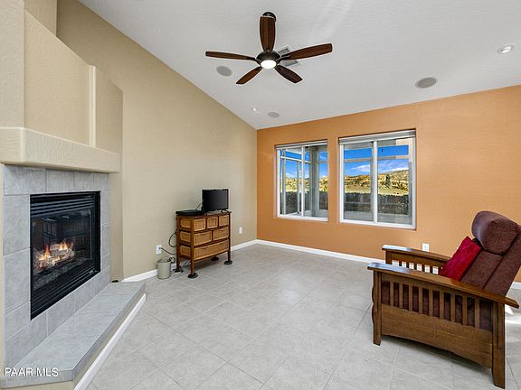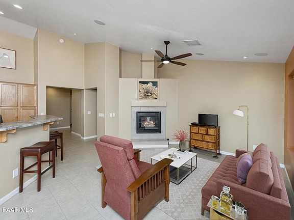Situated in the highly desirable and gated Del Webb Cottages of Prescott Lakes community, this home has outstanding curb appeal on a prime elevated view lot that borders community open space! The golf course, Glassford Hill, Granite Dells, San Francisco Peaks and the Mingus Mountain range can all be enjoyed from the owner's suite as well as the great room/kitchen/dining area, plus the rear Arizona room and patio! With no neighbor to one side and adjacent to abundant guest parking, this home has a highly desirable location within the neighborhood. The property's interior and low maintenance Hardie board siding exterior have recently been repainted, it is tiled throughout, not a stitch of carpeting, perfect for the allergen-sensitive buyer. On entrance through the security screen front door,