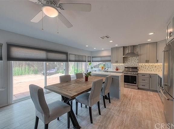 Lets be blunt here. Its time for one and done! Now is NOT exactly a good time to be going in and out of houses for sale. You know what you want; its remodeled and move in ready! This 3 bed + 2 bath contemporary home is upgraded, and gorgeous. Improvements include: stunning open concept kitchen with large seating area, new stainless steel Kitchen-Aid appliances, farm sink, under cabinet lighting, and quartz countertops with waterfall edge. Grey laminate plank flooring unites living, dining, and kitchen spaces. Sliding glass doors open to a lush green backyard with fragrant orange, lemon and peach trees, Enjoy quarantinis while sequestering with family (and eventually friends) on the big brick patio. King-size master bedroom suite features a walk-in closet, sparkling white tile shower with rain showerhead and foot comforting penny tile flooring. Currently the giant family room is doing double duty as a classroom, art studio, and gym. It could also serve as a huge 4th bedroom. Three year-old HVAC system, Low E dual pane windows & sliding doors, plus pleated window shades will save you a bundle on energy costs. Got kids? Youll certainly appreciate living in the Simi Valley Unified School district. Act now, interest rates are not going to remain this low for long.