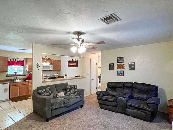 So much has been done: Fully remodeled kitchen with custom cabinets and new lighting, all windows double pane and open from top as well as bottom, tilt in for easy cleaning, tiled counter top between kitchen and living room, tile floors in kitchen and entry, thermostat upgraded, insulated garage door, keyless front door entry, covered back patio with concrete side yard and pathway, epoxy floor in garage and laundry room, concrete front porch and custom railing, moveable folding cabinets in laundry room.