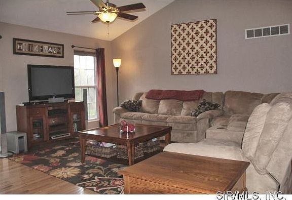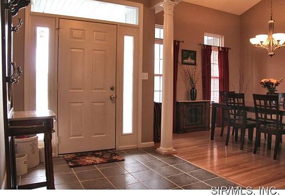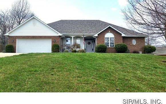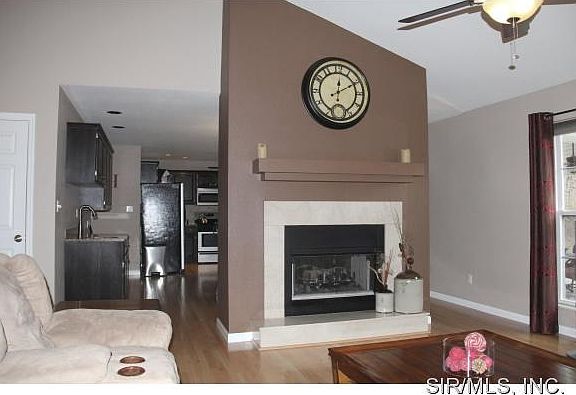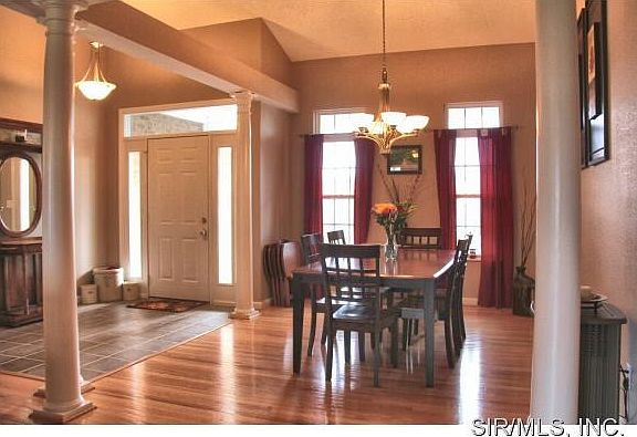 Beautiful 4 BR, 3.5 Bath ranch home with an incredible backyard backing to trees. This ranch home has columns as you enter with wood floors & vaulted ceiling that extend from foyer, to Dining Room & into the Great Room where you will find a double sided gas fireplace. Kitchen has gorgeous Cambria counters with breakfast bar, built in desk/drop zone, refaced cabinets, silver mist(no fingerprint finish-looks stainless) appliances, 2 large corner windows, wood floors & tile backsplash. Door leads to large covered patio & yard w/ blueberry bushes, asparagus & trees. Bedrooms 2 & 3 share walk through bath with two basins. Spacious master suite w/ corner garden tub, dual vanities & separate shower. Beautifully finished lower level with wet bar w/ beverage center & espresso cabinets, 4th bedroom w/ egress window, 3/4 bath, family room with built in speakers (stay), office & exercise room. This home is in a convenient location to St. Louis & walking trail in the neighborhood. Roof new in 2015