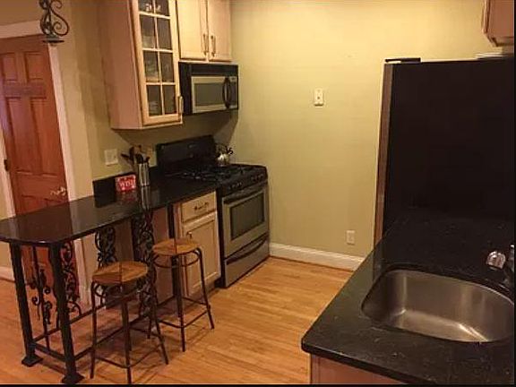 Kitchen has stainless steel appliances with granite countertops and a separate dining room. House has hardwood floors and exposed brick throughout, a full-size washer and dryer, intercom, dual zone heating, air conditioning, and an unfinished basement with room for storage. Third floor master suite has a walk-in closet and its own bathroom.