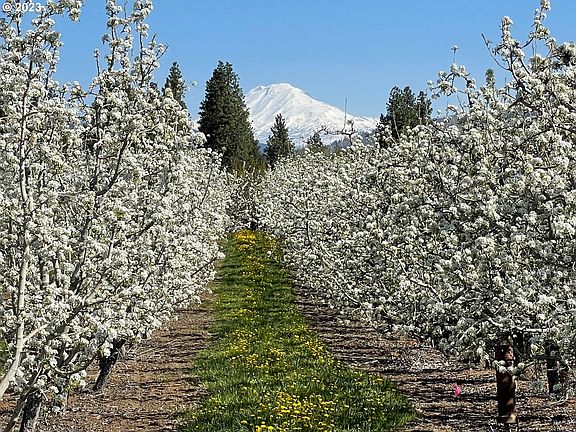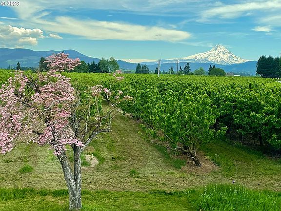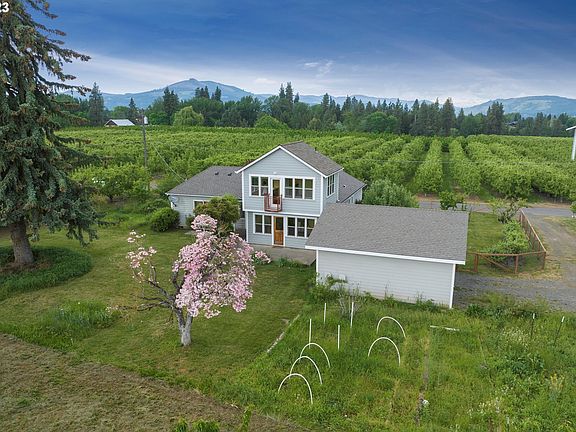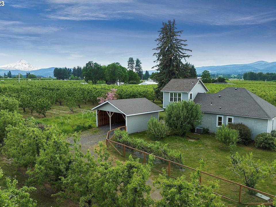 Country living! 1/2 Acre with HUGE Mt. Hood views & Peeks of Mt.Adams. Romantic patio area with trellis & Wisteria. Light filled family room off of updated country kitchen. Central dining area; oak floors. Extra large living room with newer oak floors and wonderful views. 2 bedroom & a bath on main. Upstairs, romantic, vaulted bedroom with private bath & closet; wrap around mountain views and light. Plenty of room for the green thumb, kids & pets and just minutes from town. A Private oasis! Double carport, Propane FA furnace & AC year round comfort and adventure! Property is being sold As-Is. All offers in by 5pm on Monday, May 22nd 2023 & please give through the 24th for seller's consideration.