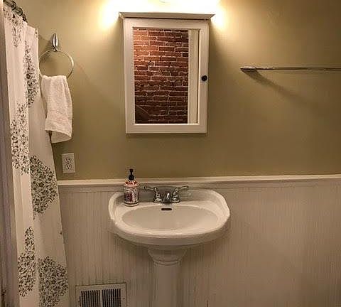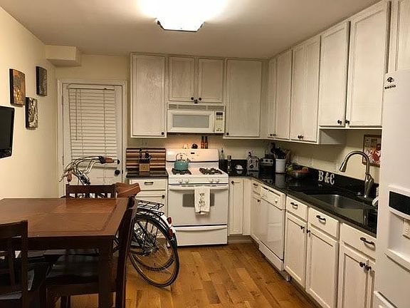 Deck off back bedroom, half finished basement, parking pad in the back, heating and ac, washer and dryer, kitchen appliances. Charming Living area for a couple or Roomate's.