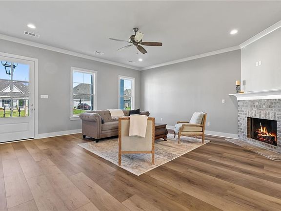 Exterior features include brick, Hardie siding, fixed board-n-batten shutters, and a hanging gas lantern. Interior features include vinyl plank and tile flooring (no carpet), custom/shaker style cabinetry, quartz countertops, ventless gas log fireplace, an upgraded kitchen appliance package including side by side refrigerator/freezer units and wine cooler, primary bathroom with freestanding tub and custom tile shower, custom closet shelving, and much more! Floor plan design features an oversized primary suite area with primary bedroom, bathroom, and closet connecting to laundry room.
