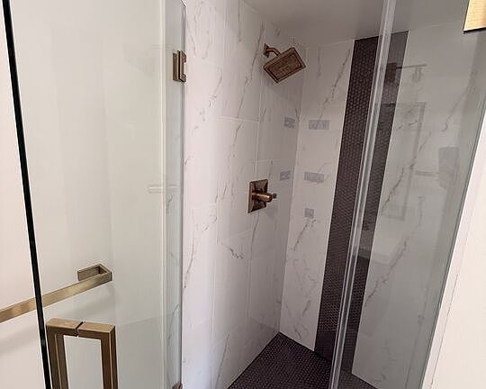 Private balconySleek bathroomPolished metal fixturesSleek lookUpdated fixturesStainless-steel appliancesNew enclosed shower