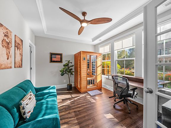 Discover refined urban living in West Raleigh at 1609 Wooster Street. This three-story Trinity Brownstones townhome offers 2,078 sq. ft. of stylish living space plus a nearly 400 sq. ft. attached two-car garage with an epoxy floor and custom mudroom built-ins. The first floor features a private office with its own full bathroom, ideal for guests or remote work. The open-concept second floor includes a chef-inspired kitchen with a large granite island, stainless steel appliances, and gas range, flowing into a bright dining and living area with gas fireplace and custom bookshelves. A balcony and half bath complete this level. Upstairs, the primary suite offers a walk-in closet and en suite with dual vanities, while two additional bedrooms share a full hall bath. Custom upgrades throughout add comfort and style.