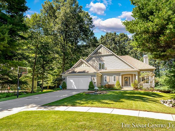 Stunning custom-built David C. Bos home located in a peaceful cul-de-sac and professionally landscaped by an award-winning landscaper. Located in the Spring Lake School district, this quality-built home has impeccable attention to detail throughout, featuring 5 bedrooms, 3.5 bathrooms, and over 3,600 sq ft of living space. You will be greeted by a spacious foyer that leads to a main floor office through beautiful French doors. The Great Room has an impressive stone fireplace and seamlessly flows into the dining area with wide-plank LVP flooring throughout the main level. The kitchen showcases beautiful Cherry wood cabinetry, granite countertops, and high-quality Bosch stainless steel appliances. Sliders open to an expansive deck that overlooks a wooded view - perfect for outdoor entertaining or relaxation. The main floor primary suite features tray ceilings, offering a private retreat with an ensuite complete with a soaking tub and walk-in closet. Finishing the main level is a half bath and laundry room with a folding counter for added convenience. Upstairs you will find three more bedrooms and another full bath, providing ample space for family or guests. The finished lower level offers a family room, a spacious gym, a bedroom, a full bath with tiled floors, a 2nd office, and plenty of storage options. New HVAC in 2022.