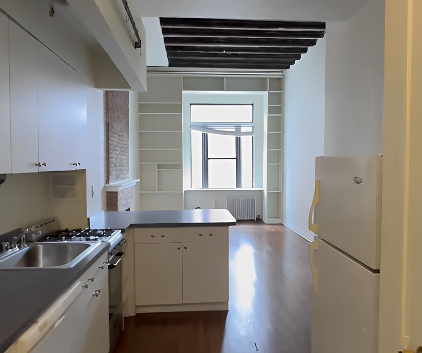 Warning! This apartment is far larger than it appears in pictures due to its soaring ceilings and over-sized windows. This loft-like 1BR, offers 12 ft beamed ceilings, built-in bookshelves, a breakfast bar, 3 great closets, a deco fireplace, exposed brick, a dishwasher, and fantastic light. The location is excellent and it's only 2 very quick flights up. There is plenty of space for entertaining in the living room and the bedroom fits a Queen sized bed.