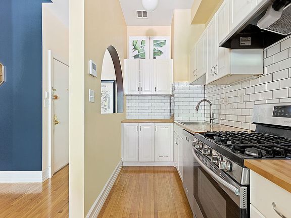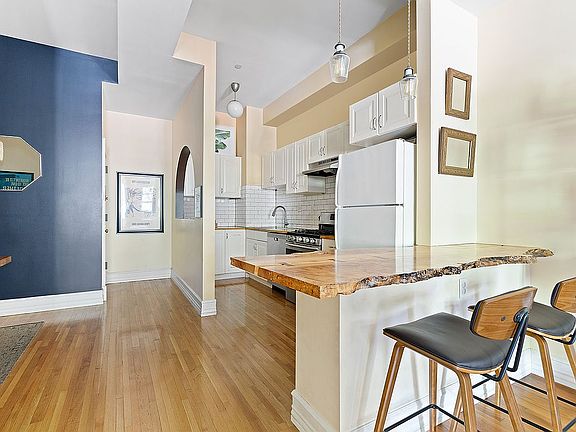 This home is so much more than your average one-bedroom CONDO, you need to come and see it in person! Situated in a charming pre-war building in the heart of Fort Greene, enjoy an oversized one-bedroom home with the added bonus of an extra room that can be used as a formal dining room, home office, nursery, or whatever your heart desires! With soaring 11' ceilings, beautifully renovated kitchen and bath, and the truly unique fact that this is a CONDO, not a coop, with the charm of history and a location that can't be beat. Situated just two short blocks to leafy-green Fort Greene Park and around the corner from every amenity that you could ever imagine on newly revitalized Myrtle avenue, including restaurants, shops, coffeeshops, nightlife and more. On the second floor, just one flight up, it's easy to love this apartment in a building that also features a beautifully renovated common roofdeck with views of the surrounding treetops and architecturally significant architecture, bike storage in the hallways, and storage closets available for rent. Every apartment in this building even has its own private vestibule for additional storage, perfect for seasonal clothing changes and sports gear! Enter into a light and bright West-facing home with a renovated and open kitchen distinguished by an arched opening, a butcher block countertop, stainless steel appliances, white cabinetry, subway-tile backsplash and a truly special rustic chic live-edge eating island custom made just for this space! Illuminated by a pair of antique glass pendant lights and super helpful task lighting throughout. Cabinet and counterspace is abundant, and a generous dining room awaits conveniently adjacent to this space. Should you not need such a large dining room, this extra space also makes a fantastic home office, or even guest area, complete with two large closets and an added niche for extra work space. The spacious living room accommodates both dining AND living should you need the dining room for extra work space, or just live large and entertain a crowd. A comfortable and sunny bedroom offers an added dash of charm and coziness with its exposed brick wall, two deep closets, and an extra area for a desk or dresser should that be necessary. Wake up to the sounds of the birds chirping in the cascade of green outside your oversized and new windows. A spacious bathroom has also been upgraded recently and includes a classic combination of white mosaic and subway tiles, great storage, and a tub/shower combo. Super low monthly taxes and common charges complete the picture in this professionally managed 8-unit building. This is also a dog-friendly building with easy park access, subletting is allowed, and parents are allowed to buy for children. Live AND invest in one of the most beautiful neighborhoods in Brooklyn a stone's throw from subways, buses, the Navy Yard, Dekalb market, the new Wegmans, in addition to all of the local favorites.