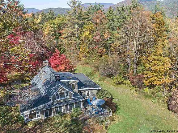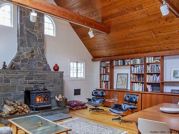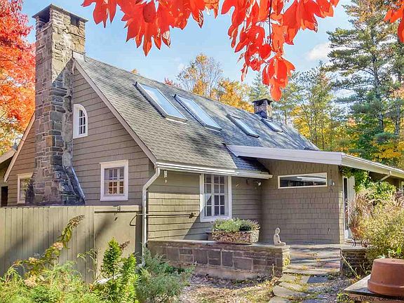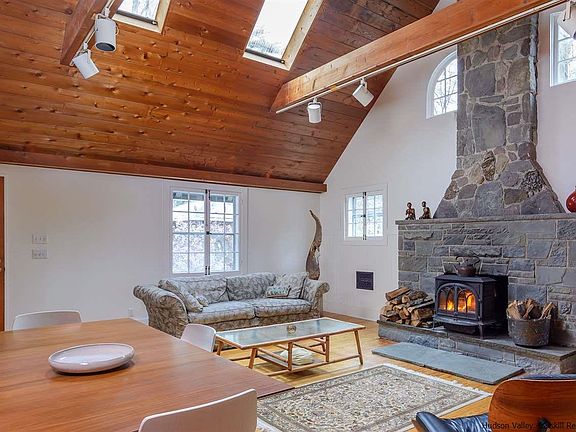 This stellar Woodstock location, just 2 miles to town, is the kind of sturdily built and lovingly crafted home that one seldom sees any longer and features a quintessential Woodstock great room with beams, vaulted ceiling and a big fireplace throwing out warmth and good cheer. Imagine dining with friends or family in such a space! The house has a wonderful layout that includes a kitchen that opens onto a second living space - a light-filled four-season sun porch with woodstove and views of the landscape on three sides. The open layout of the living area combines brilliantly with the privacy of two very different bedroom suites. The huge, newly renovated first-floor master suite includes an entry alcove, large bedroom and bathroom and a second room currently used as an office. The lofted second-story bedroom suite features a magical, aerie-like bedroom with windows on three sides, a spa room with a two-person air-jet tub and an open area that is perfect for yoga, relaxation or play. A third potential bedroom - or den or office - is on the first floor and can be open to the sun porch thru sliding shoji doors. (The town of Woodstock lists it as a two-bedroom home but there is another room with a window and closet that can be used as a third bedroom.) Abundant closets and built-in storage throughout. Outside, enjoy the privacy of the back deck or front patio, the wide variety of landscaping and a seasonal view of the mountains. Privacy, charm, spaciousness, light, function - these are hallmarks of this special home on the market for the first time in over 40 years.
