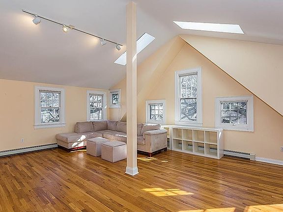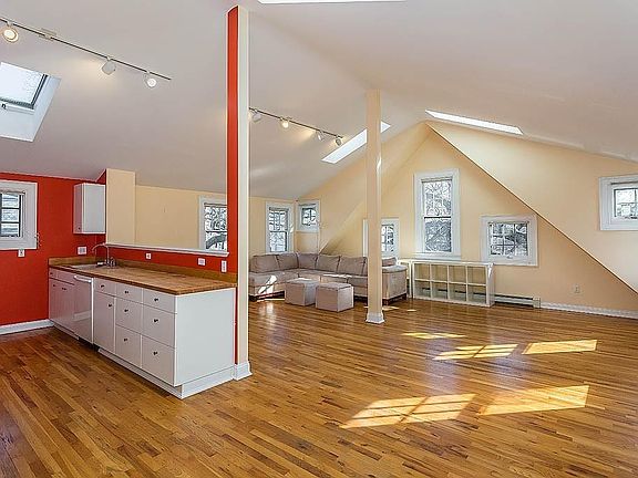 Light and airy top floor condo built by David Aposhian. Open loft style living space with cathedral ceilings, skylights and tall windows that bring amazing natural light any time of the day. Two good size two bedrooms with closets and a private balcony. Hardwood floors throughout. The best part is that there is a private fenced-in yard with patio and area for your garden. In-unit laundry, one off street parking. Heat and hot water are included in the rental. Even though winter is over, next year's snow will be cleared by association! Convenient to Central Square, MIT, Harvard, downtown. Near many restaurants/cafes, schools, public transport.