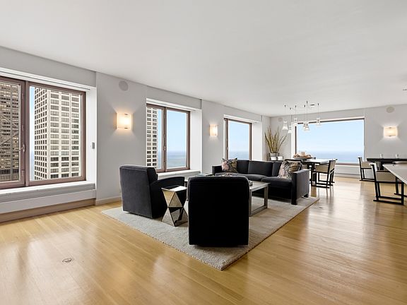 A home in the sky with sweeping city & lake views! Perched high on the 53rd floor, this stunning corner residence is truly a home in the sky. With the coveted **A-tier-the largest floor plan in the building-**you'll enjoy dramatic wall of windows with floor-to-ceiling views stretching from Navy Pier across Lake Michigan to the glittering Chicago skyline. Recently reimagined with a sleek, open-concept design, the luxurious kitchen is the centerpiece of the home. Start your mornings with an espresso from the built -in Miele cafe station, cook with a view from your Wolf induction cooktop and unwind with a bottle from the full-height wine fridge. The show-stopping extra-long, two-tiered stone island is perfect for entertaining while taking in the breathtaking views stretching as far as the eye can see!!! The primary suite basks in the glow of sunrises and sunsets over Navy Pier. Experience true luxury in this expansive master suite, designed to impress with unmatched comfort and sophistication. Featuring 2 newly rehabbed en-suite bathrooms adorned with timeless marble tile finishes, white oak vanities, a giant soaker tub and walk in shower. This retreat offers the ultimate in privacy and elegance. The suite boasts two spacious walk-in closets, providing abundant storage and organization, along with a dedicated sitting room that frames breathtaking views of Navy Pier and Lake Michigan. The versatile third bedroom is designed with flexibility in mind, featuring a custom retractable wall that seamlessly tucks away for open entertaining or closes to create a private retreat. A built-in entertainment center enhances the space, perfect for hosting or relaxing. A custom doorway leads directly to the hall bath, while Lutron lighting throughout adds a modern touch. All doorways have been thoughtfully redone to accommodate taller, more dramatic doors, elevating the home's sense of scale and style. Enjoy the well-appointed laundry room with Electrolux full size side-by-side washer/dryer, and a stylish powder room appointed with marble tiles, floating vanity with a Kohler sink. The Olympia Center embodies luxury life style experience with 24-hour door staff, indoor pool, whirlpool, sauna, steam room, party room, and on-site management. Parking is available for lease in the attached heated garage. Living here is a life style to love!