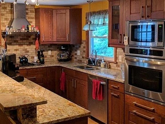 • Kit Dscrp: Flooring - Hardwood, Countertops - Stone/Granite/Solid, Deck - Exterior, Kitchen Island, Stainless Steel Appliances, Slider, Gas Stove