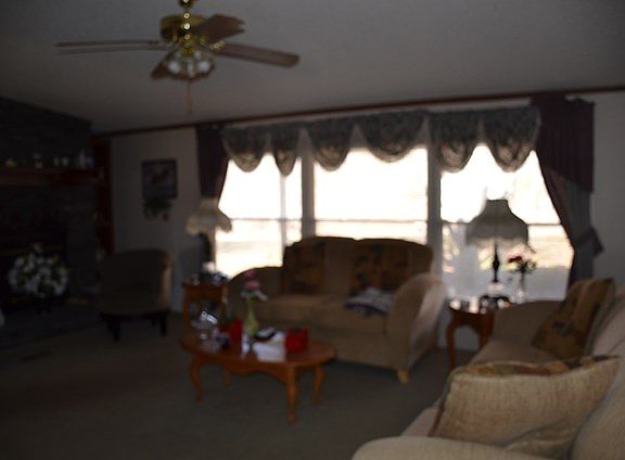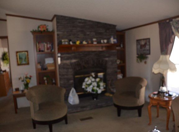 This manufactured home was built in 2002 and looks practically brand new. Wood burning fireplace, large living room, dining room and extra large kitchen with lots and lots of cabinets and counter space. Island bar, includes range, hood, dishwasher, refrigerator, washer and dryer. Some of the furniture will also be included. Home has covered front porch and also covered deck..Even enough room for small garden New metal roof about 2 years old.