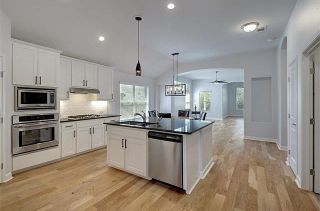 It is a 1-story, 3/2, 2.5 car garage. Originally built 2012 by Meritage Homes. New custom white kitchen with pantry, black granite counter tops and all new/never have been used stainless steel appliances, new windows, new doors, new floors, new from the studs out. It has a front room that had been used as an office, eat-in kitchen with an island with an open concept living room with media hook-ups, an additional sitting (keeping, hearth, flex space). Master suite with 5 piece bath, separate closets.