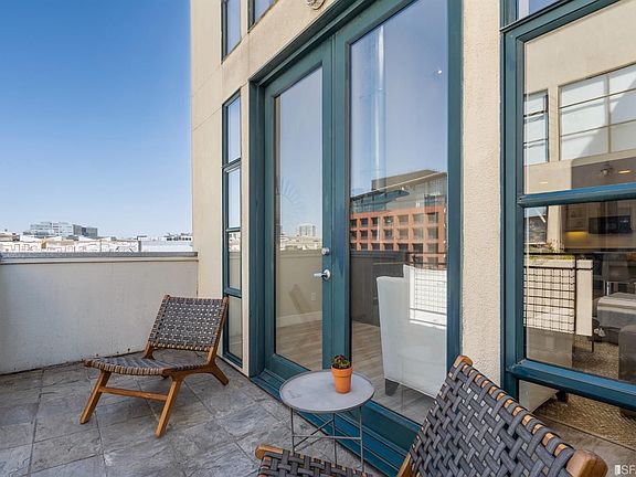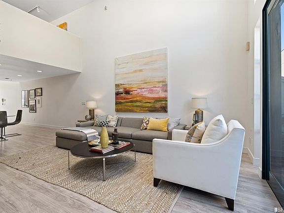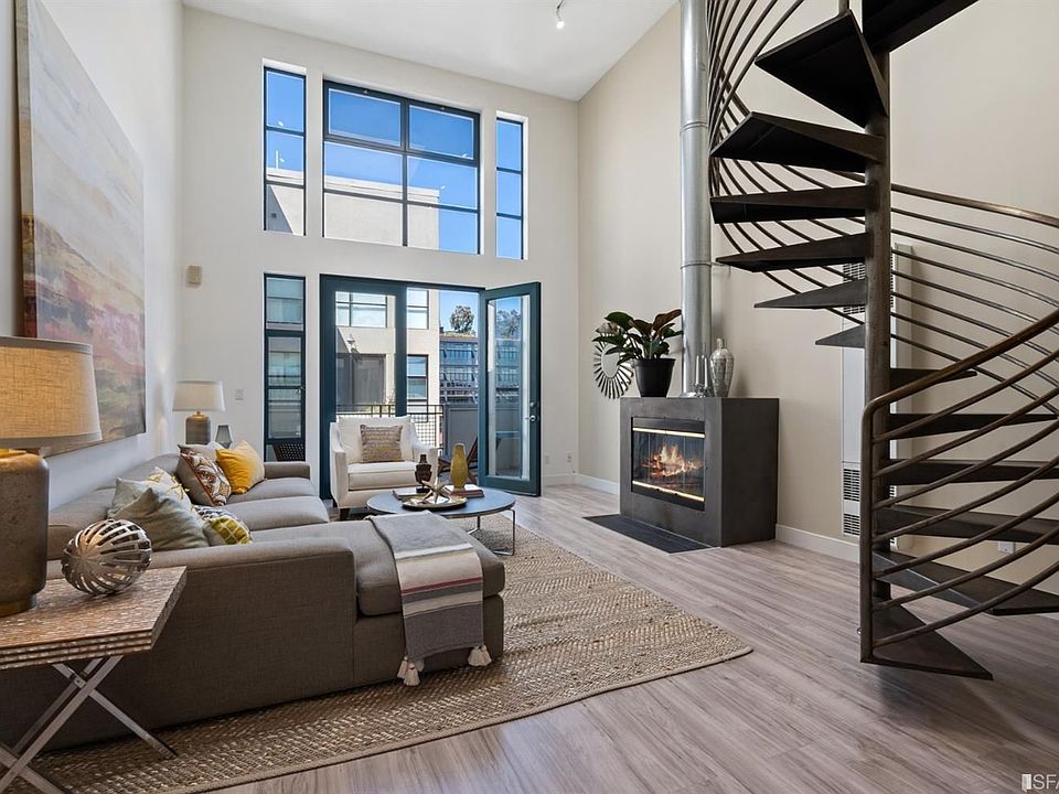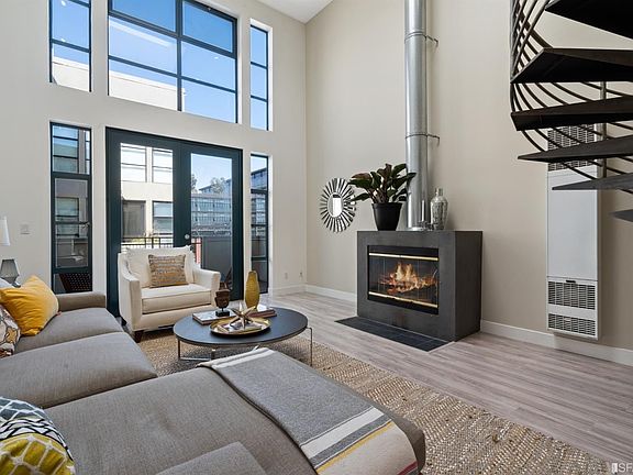 This bright top floor corner 1 bedroom+den, 1.5 bath Live/Work loft with 16'+ ceilings and 2 skylights has a private art gallery feel and has everything you need in a home. The sunny living/dining/kitchen great room is anchored by a wood-burning fireplace and has floor to ceiling windows that open out to 1 of 2 deeded patios. New wood floors throughout main level. Modern kitchen with granite countertops, newly painted cabinets, gas range, dishwasher, microwave, in-unit w/d. Flexible front room can be used as a den/guest space and has direct access to the larger southwest facing walk-out patio, perfect for outdoor dining or to create your urban garden oasis. The airy upstairs loft has an en suite bath with jacuzzi tub. Boutique 16 unit bldg includes a common roof deck w/ panoramic city views, an intercom entry, large storage closet & garage parking. On quiet street, minutes to coffee, restaurants & shopping, a true commuter's paradise, with Muni, Caltrain & freeway access nearby.