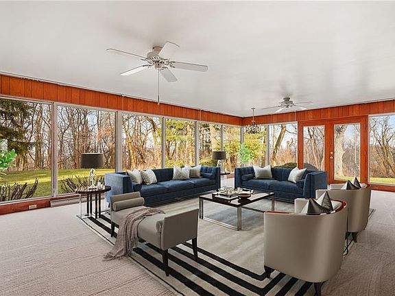 SPECTACULAR RANCH IN A PRIVATE CUL-DE-SAC SETTING! Custom built by the original owners with mid-century modern elements. You'll be wowed by the impressive 25' great room with walls of windows providing unspoiled views of the table top yard bordered by woods and privacy. A tile foyer leads you to a formal living room with large picture window & a stone fireplace flanked by built-ins. Bright eat-in kitchen with medium tone wood cabinetry pairs nicely with the neutral countertop & ceramic tile floor. The kitchen has easy access to the formal dining room which is open to the great room. Enjoy 3 spacious bedrooms all with double closets including the master with private 1/2 bath. There's also a large ceramic tile hall bath equipped with a tub & separate shower. The finished lower level is massive with a wet bar and plenty of space for entertaining, gaming or a theatre. You'll love the "feel" of this house as well as the location. Convenient to Oakland, Pittsburgh & South Side.