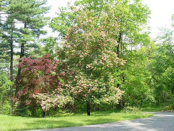 Attention Nature lovers! Remarkable Contemp. Hillside wooded setting. Every room opens up to the freshness & beauty of the outdoors! Great center LR fronted on 3 sides by sliders, high windows, open to spacious kitchen & dining & full front decking. Main level MBR suite also open to decking, w/full bath, Jacuzzi, shower. Two 2nd stry BRS each w/private front deck; balcony overlooking LR, walls of windows, marble FPL. Full fin. LL incl. in sq. ft. w/center FR, BR, den & 3rd bath plus kitchen area, ideal for guests, au pair, all w/full sliders to the outdoors. Palladian & sky-lit foyer. Versatile 7+ acres, room for gardening, hiking & recreation. Indoor/outdoor living/dining Spring-Fall. Charming & practical gas stoves.Great weekend hideaway!