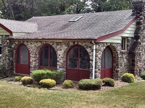 Modern with original charm corner 2-3 Br stone house with 1.5 baths, Gar, WBFP HW floors and lodge like FR ,DR porch w/ stone arches,and patio. Beautiful inside and out Low maintenance MOVE IN HOME 1of a kind house with modern finishes. Great LR cathedral ceilings &hardwood. 2-3 brs 1.5 baths big kitchen covered porch to relax on. Amazing wood work and details  Custom FP, 3 entrances, detached garage, alarm , laundry and storage in basement. custom doors to every entrance . LR has high beamed ceilings with skylight and stone WBFP small den/bar area adds an extra place to enjoy a book, a drink, or guests. This will not last long. NO FLOOD