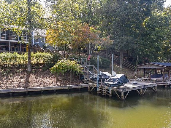 This waterfront home offers a perfect blend of indoor and outdoor living spaces, with an emphasis on water-related activities and entertainment. Outdoor areas include a covered patio with a large built in granite bar. 3-bedroom, 2 bathroom open floor plan home. Kitchen Island/breakfast bar looks out to the large family room with a wood burning fireplace and high ceilings. Expansive screened porch(324 Sq Ft) off the main living area overlooking serene water views. The master bedroom has a walk-in closet, double vanities, separate garden tub and shower. Large laundry room with lots of storage.Single boat house and stationary dock with 2 jet ski lifts and multiple outdoor decks to enjoy outdoor living! Private wooded lot and nestled in a quiet cove near "Two Tree" island. Waterfront, 3 bedroom- split floor plan, 2 bathroom, large open living area. 324 foot Screened patio, covered patio wet bar with granite counter, multiple decks. Stationary Jet ski docks and single boathouse. Roof less than 5 years old.