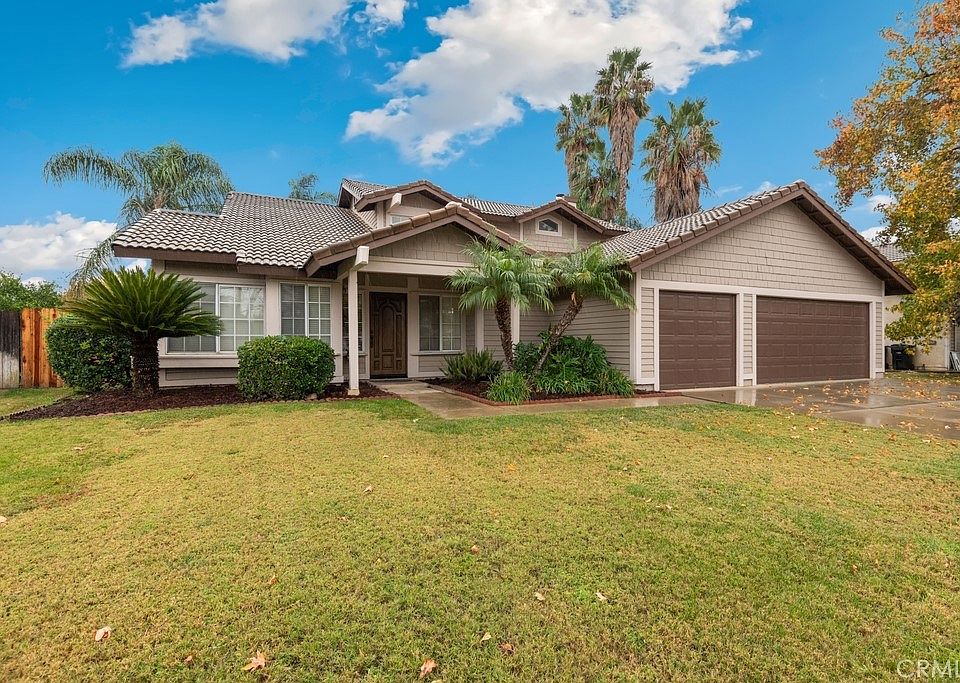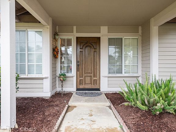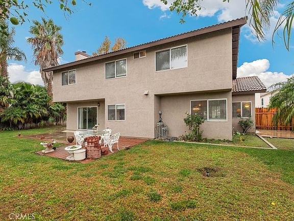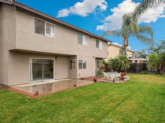 Move in ready 4 bed, 2.5 bath home with great curb appeal, and an attached 3-car garage is ready for its new owner! The interior offers a spacious floorplan with high ceilings, and carpet floors. Enter into the formal living room and dining room which opens to the kitchen with wood cabinetry and bar seating area. The kitchen overlooks the separate family room with fireplace and sliding glass door to the backyard. A den/bedroom option as well as a half bathroom complete the 1st floor. Upstairs you will find 3 more bedrooms including the large primary suite with private ensuite offering dual sinks and a walk-in shower. There is also a full-size "jack and jill" bathroom between the 2 secondary bedrooms. Enjoy the private backyard with grass area, beautiful palm trees, concrete area, and pavers - this is the perfect space to relax or start your own garden! Conveniently located near schools, shopping, dining, and not far from the 210 Fwy! Also there is no HOA! Come view this great home today!