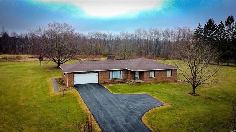 Nestled on a level two acres in Center Twp, you'll be delighted with the space and room to roam this all brick ranch offers. With flowing floor plan this home opens to a spacious living room with wood burning fireplace and plenty of natural light, large kitchen features ample counter and cabinet space with dining area abutting French doors that walk out to level back yard. Two full baths, one of which has been updated. Partially finished lower level, recently painted and vapor locked, offers game room with another wood burning fireplace, laundry room with new laundry tub, new H2O tank, and plenty of room to finish and make more living space if needed. Paved driveway with extra parking and a two stall garage with cement floor has dual entry into home via kitchen and basement. Easy access to Route 8!