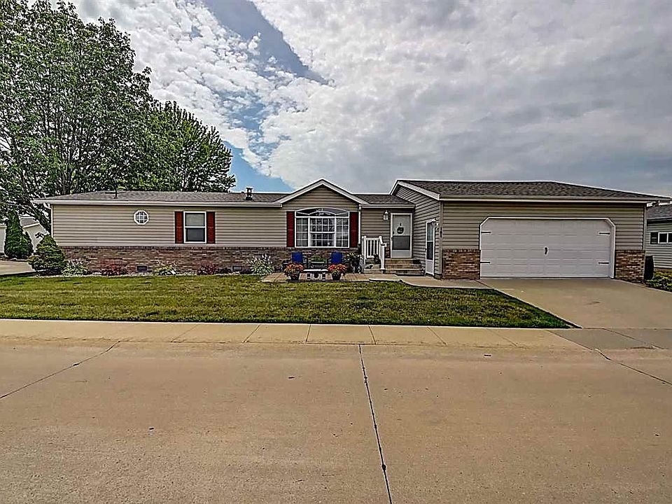 Beautiful and well-maintained custom ranch home in the Paddock at Saddlebrook. A partially-bricked front and paved patio welcome you to over 1,700 sq. ft. of living space with all the bells and whistles! The home features 3 Bedrooms - including a large Primary Suite - Living Room, Family sitting area, Dining Room and a very spacious kitchen. A beautiful arched picture window, fireplace and vaulted ceiling grace the large living room. The kitchen has a large breakfast-bar peninsula, center island and several pantry cabinets. All appliances stay, including the front-load washer and dryer. There's quality laminate flooring throughout. The finished, attached 2-car garage is lined with storage shelving and workbenches. The taxes are super low. Price includes 990-year lot lease. And you have access to all the wonderful Saddlebrook amenities, including Clubhouse, fitness center, walking trails, fishing pond and more. They don't get much nicer than this, folks!