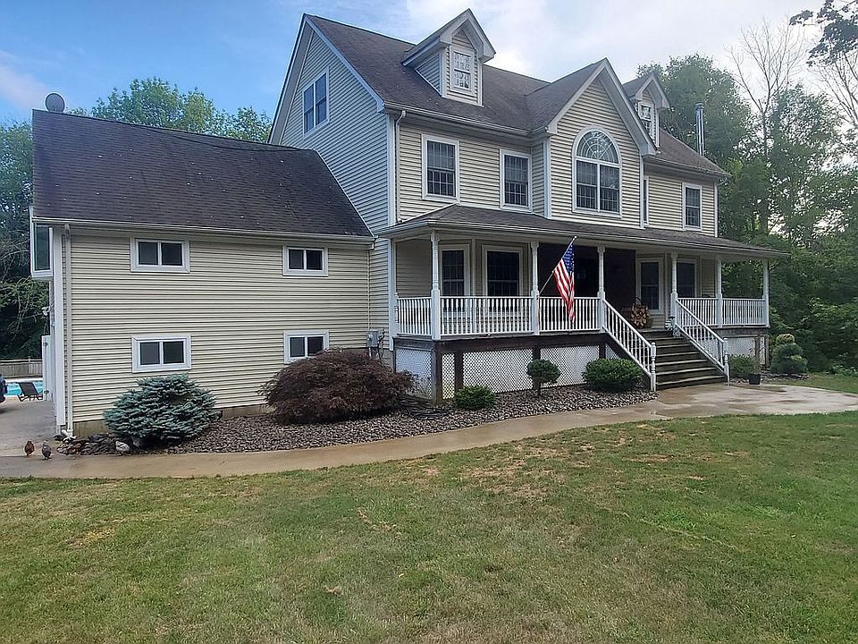 Back on the market after a pending sale collapse. This beautifully sited home has been cared for, landscaped and upgraded to the max! Light fixtures, doors, kitchen upgrades..in ground pool and patio for summer fun. This owner took great pride in his family home and now you have a chance to own it. Full finished basement with summer kitchen, great potential mother daughter set up. Walkout to pool for ease in summer entertainment. The home gym/office built over the finished garage, is safe and convenient for home fitness, with no risk to your health. Walk up attic can be finished to add even more space! One hour to NYC for easy commute. 5 minute drive to the Woodbury Commons, shopping centers and public transportation. Privacy abounds on 16+acres as the home sits back from the road and is barley visible. Approaching the new front door with upgraded stone exterior, you'll feel like you've arrived! The detached two car garage, stores your extra recreational vehicles and pool equipment, doubling as a workshop too. You must see this home. It will win your heart. Enough parking for 10 cars!