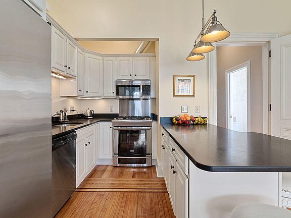 Exquisite 2 bedroom condo in an exceptional Beaux-Arts building in Portland's desirable West End! Grand facade showcases the home's architectural beauty. Welcoming entryway leads to the unit accessible both by the main entry and hallway entry. Instantly you're greeted with a well appointed living space, with window-lined walls filling the room with abundant natural light. Tucked down the side hallway is the master suite, complete with stunning en-suite bath, tile shower, and double vanity sinks. Large closet and laundry complete this wing. Efficient galley kitchen features stainless steel appliances, white cabinets and charcoal gray Corian countertops, and room for seating. Just down the hallway lies a spacious living room with high ceilings, oversized windows, crown moulding, and a wonderful fireplace with mantle. Uniquely patterned hardwood floors elevate the room's elegance. Head up the staircase in the kitchen to the second bedroom, where you'll find enough space for bedroom furniture and even fitness equipment! Full bath for your comfort. Enjoy the benefits of living downtown without the hassle, as this condo has designated deeded off-street parking behind the building, and plentiful street parking for company. Relax on the private covered porch, take a stroll down the tree-lined streets, enjoy a jog at the famous Western Promenade, or head to one of Portland's renowned restaurants.Enjoy the rear covered porch overlooking the garden. Enjoy the convenience of 2 deeded parking spots outside your back door.