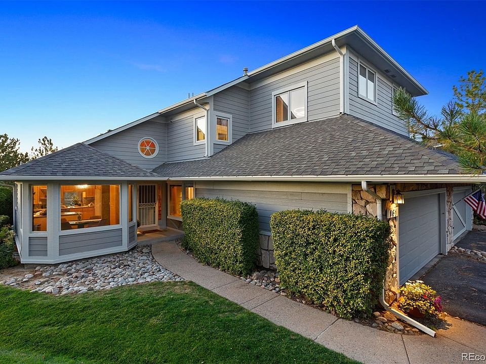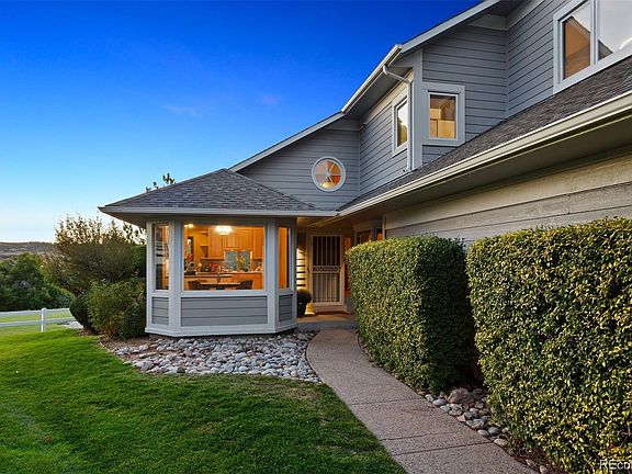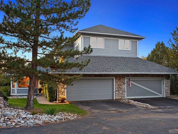 This 3 bedroom | 3 bathroom paired home offers the rare double bonus of big mountain views and an exterior deck that backs to the first tee of the Plum Creek Golf Club. On entering, you're instantly drawn into this sunlight-drenched, open concept home designed with indoor + outdoor living in mind. The spacious, combined living and dining rooms open to a large exterior deck, perfect for sunset cocktails with direct views of Sleeping Giant. The living room features a vaulted ceiling, wood beams, and a gas fireplace offering a perfect place for gatherings and entertaining. The form meets function kitchen includes a lovely breakfast nook with oversized bay windows and pass through to the dining room. A bedroom, bonus room | office, FULLY updated bathroom with floating vanity and floor to ceiling tile, laundry room and 2-car garage with storage complete the main level. Upstairs, the owner's retreat offers mountain views, a FULLY updated incredible primary bath with quartz counters, dual vanities and oversized + organized walk-in closet. The finished lower level includes a recreation room with gas fireplace, wet bar, bedroom, and bathroom. This owner invested an impressive six figure sum in the main level and primary bathrooms. Additional features include hardwood floors on the main and upper levels and new upper level stair carpet. This lock and leave home includes 2 bathrooms worthy of a mansion and additional space that's ready for your personal palette. 5 minute drive to upscale restaurants and shopping in adorable downtown Castle Rock. With golf, hiking, biking, walking trails and a wildlife viewing corridor right outside your door, plus a quiet, private lot, this residence offers a rare blend of convenience, comfort, and quality.