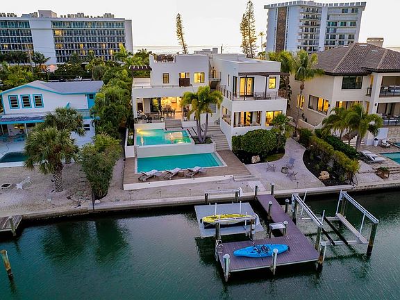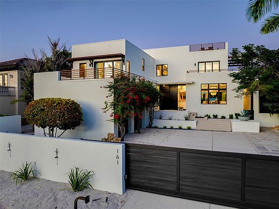 In a world where more is usually never enough……. 161 S. Polk Drive is MORE and JUST ENOUGH OF EVERYTHING YOUR DREAMS ARE MADE OF! Positioned waterfront between St. Armands Circle and Lido Beach, you can start your day walking just one block to put your toes in the sand and soak up the morning sun and then head straight to your favorite lunch spot on the circle. Upon returning home, take up lounging in the split-level, salt water pool and relax to the sounds of the water as it crests the infinity edge OR you can choose one of the many decks, from rooftop on down, canal to Gulf, to savor the sun, the breeze, the views and the peacefulness all around you. Once evening arrives, hop on the boat for a pleasant ride to your waterfront dining of choice or enjoy a glass of wine as you unwind with soothing music, the gentle movement of the water and savor the setting sun. This privately gated, coastal contemporary home encompasses over 4,600 square feet of interior living space with an open plan from living to dining to kitchen and on to the outdoor patio with a full wall of pocketing sliders. The acacia wood floor will be the first to grab your eye, but you will then be drawn to the unlimited other features of this home. From the many windows offering abundant natural light, to the built-ins, wet bars, oversized kitchen island, 3 en-suite bedrooms all with private balconies (includes first and 2nd floor owner suites), elevator, outdoors showers, sauna, ‘hidden’ oversized laundry room with 2 sets of washers and dryers, oversized boat dock with 2 lifts……. Shall I go on?? The well thought out configuration of this home rationalizes JUST ENOUGH of comfortably elegant entertaining mixed with intimate peace and privacy. Recent improvements include A/C handlers and compressors, tankless water heater and pump, flat tile roof decking, refinished exterior wood railings, pool pumps and actuators, in-ground drainage system, refreshed landscaping, exterior pressure washing, recent elevator service completed
