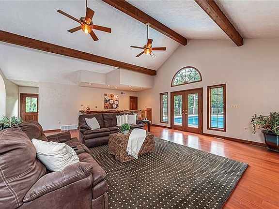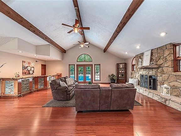 Nestled on 5 private picturesque acres, this stately home is a retreat for all seasons! The rustic farmhouse kitchen with a pine ceiling, features granite countertops, farmhouse sink, double stainless oven and a large oversized island/breakfast area. The family room with a stone fireplace has a planked ceiling that soars to the Balcony loft with exposed beams and a beautiful gas stone fireplace. Master en-suite offers a new bath featuring decorative tile, a seamless glass shower door and farmhouse vanity. Vaulted ceilings aligned with wooden beams, stone fireplace and a wood burning stove, large wet bar with stone inlay and French doors leading to L-shaped in-ground pool accentuate the large great room. Second luxury size bedroom provides a sitting room atmosphere with a stone fireplace. For those who dream of enchanting delights....this home is a dream come true!