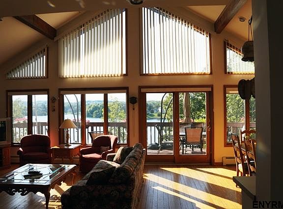 Amazing lake home at Sleepy Hollow Lake with spectacular lake and mountain views. This contemporary home is the perfect home for living and entertaining at the lake. There are 6 bedrooms and 2 master bedrooms with one on the first floor and one on the second floor. The living room has a wall of windows leading out to a huge deck, a stone fireplace and cathedral ceilings. There have been many recent updates including a roof, furnace, hot water heater, dock and beautiful lake front beach and patio!