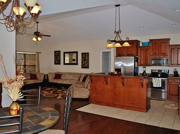 Stunning 3 bedroom 2 bath home detailed with beautiful stone work .This home features vaulted ceilings in the living,dining,kitchen,master bedroom,and second bedroom.Also features beautiful custom cherry cabinets,ceramic tile,and hardwood floors